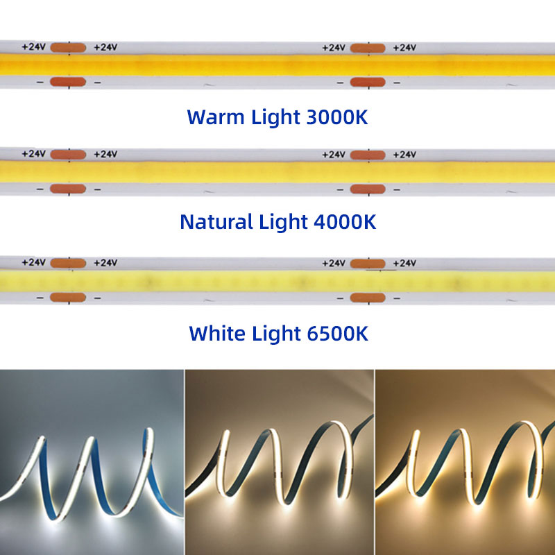 This is a COB LED light strip. It can achieve a uniform illumination effect without light spots or leaking beads. Common working voltages include low voltage types such as 24V, with ultra narrow light strips, such as 8mm width, and good flexibility. Suitable for indoor decorative lighting, it can be used in home decoration scenes without main lights, such as ceiling and background wall decoration, and can also be used for lighting in commercial places such as shop windows and signs.